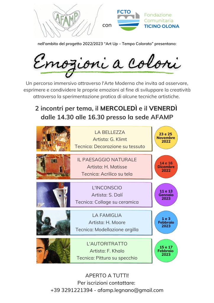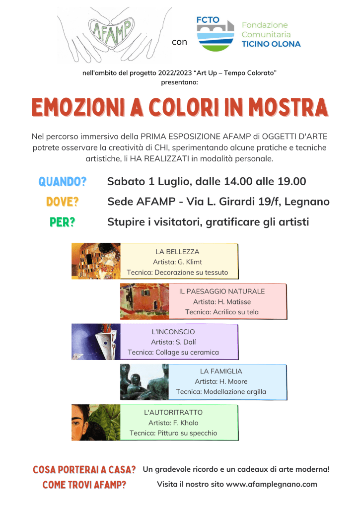 A conclusione del bando “ART UP – Tempo Colorato”, AFAMP ha organizzato un’esposizione degli oggetti d’arte creati artigianalmente negli incontri dedicati alla sperimentazione di diverse tecniche artistiche. Leggi qui l’articolo di Sempione News!