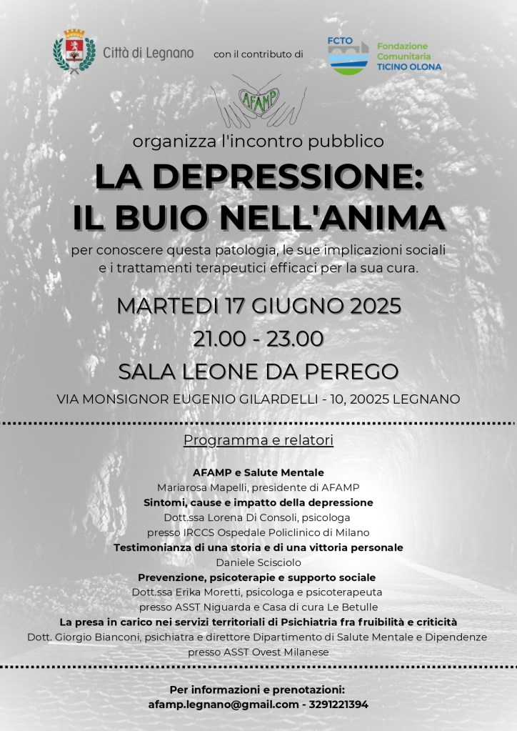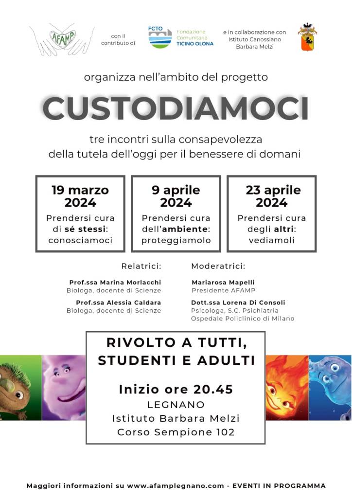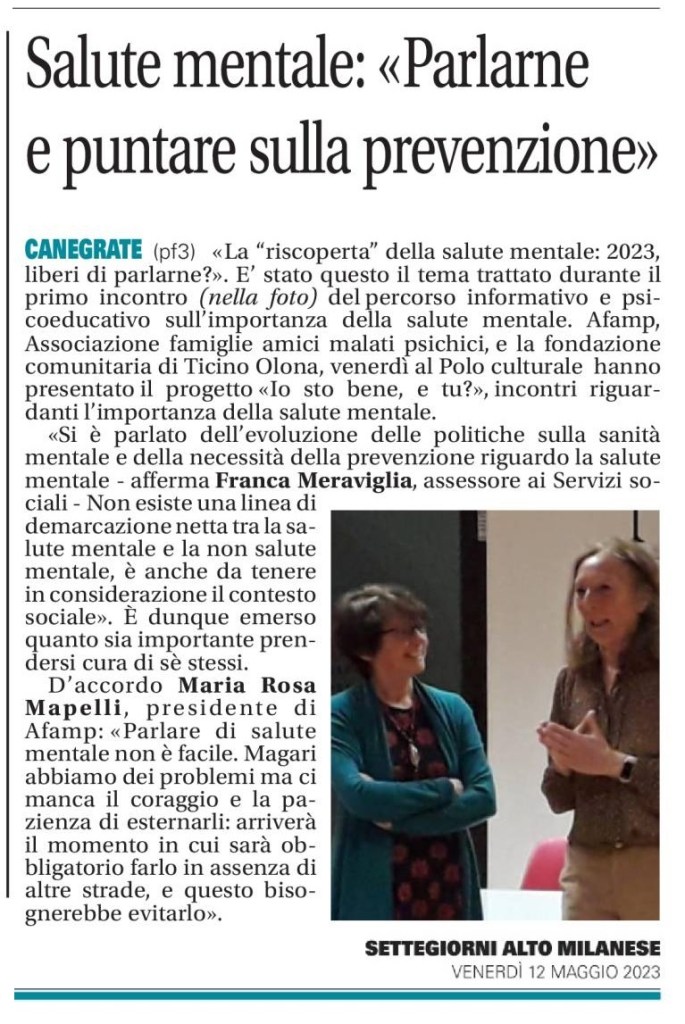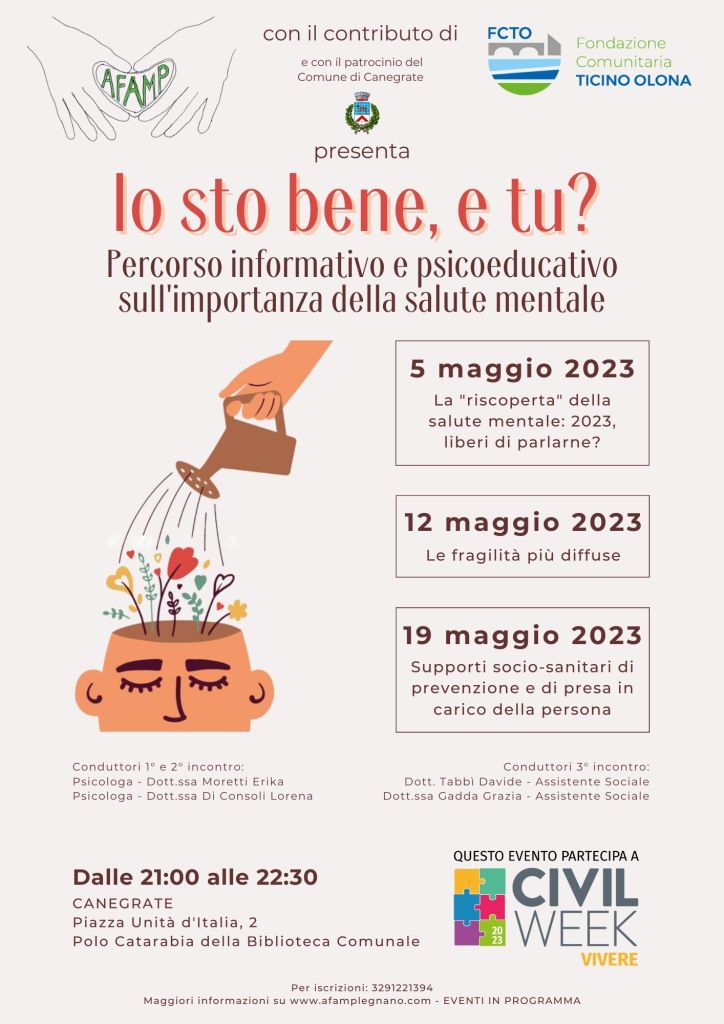 AFAMP, insieme a Fondazione Ticino Olona ed il comune di Canegrate, ha contribuito alle iniziative della “Civil Week 2023” organizzando un ciclo di tre incontri, gratuiti ed aperti a tutti, su di un tema caldo e di grande importanza: la Salute Mentale. Presso la Biblioteca Comunale del Comune di Canegrate, si è riflettuto insieme sull’attualità del concetto di salute mentale in Italia, sulle fragilità e le patologie più frequenti nel 2023 e sui servizi territoriali, e relative criticità, per prendersi cura del proprio benessere.